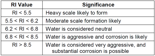 Ryznar Index(RI 또는 RSI)는 물에 탄산칼슘 스케일이 형성될 가능성을 예측하는 지표로 LSI의대체 방법입니다.