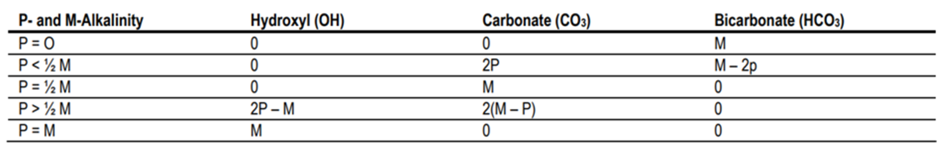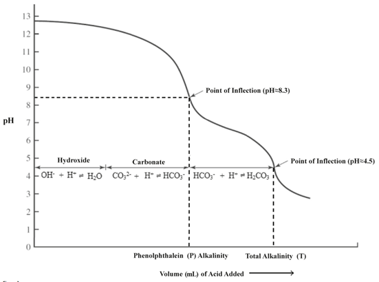샘플에 산 (H2SO4, HCl 등)을 주입하여 pH 8.3 페놀프탈레인 (Phenolphthalein) 종말점까지 낮추는데 소모된 산의 양을 CaCO3 상당량으로 환산하여 표시한 것을 P-Alkalinity 라 하고, 더욱 산을 주입하여 pH 4.5 메틸오렌지(Methyl orange) 종말점까지 낮추는데 소모된 산의 양을 CaCO3 상당량으로 환산하여 표시한 것을 M-Alkalinity (Total Alkalinity) 라 합니다.